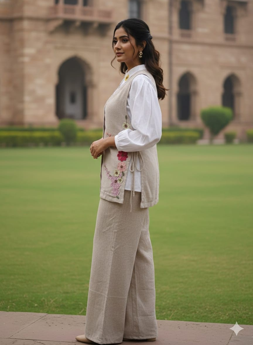 Upgrade your wardrobe with this elegant Jute Co-ord Set with Shirt, a stylish 3-piece outfit for women designed for everyday elegance and comfort. This beautifully coordinated set features a perfect blend of premium jute fabric and soft cotton, making it ideal for casual wear, office looks, festive gatherings, and semi-formal occasions.
